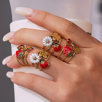Anello in acciaio inox placcato oro 18K piccolo crisantemo smalto alla moda glassa rosso fragola Design nicchia